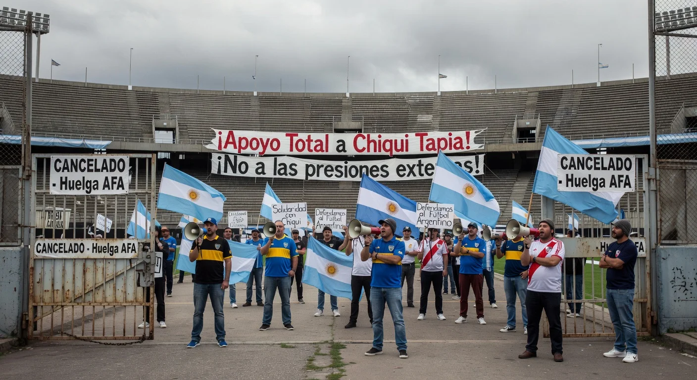 Empty Argentine soccer stadium with protest banners and supporters during AFA strike backing Claudio Tapia amid tax probe.