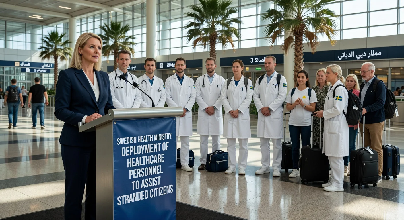 Swedish Health Minister Elisabet Lann with healthcare team arriving in UAE to aid stranded Swedes amid regional crisis.