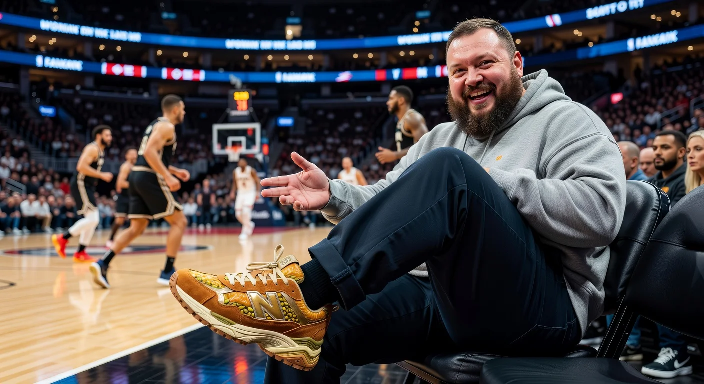 Action Bronson displaying New Balance 2811 Baklava sneakers courtside during NBA game.