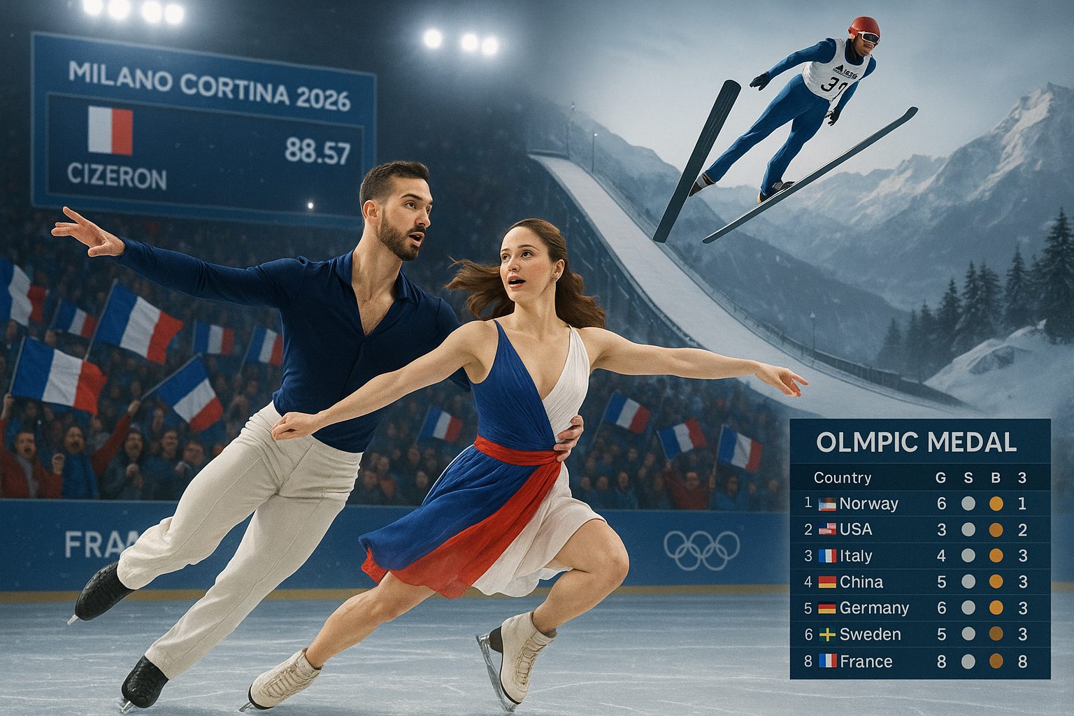 The French team experienced a mixed day on Monday at the Milan-Cortina Winter Olympics, winning no medals but showing promising performances in figure skating. Guillaume Cizeron and Laurence Fournier Beaudry led the rhythm dance program, while Valentin Foubert nearly reached the podium in ski jumping. The tricolor delegation slips to 8th in the medal table.