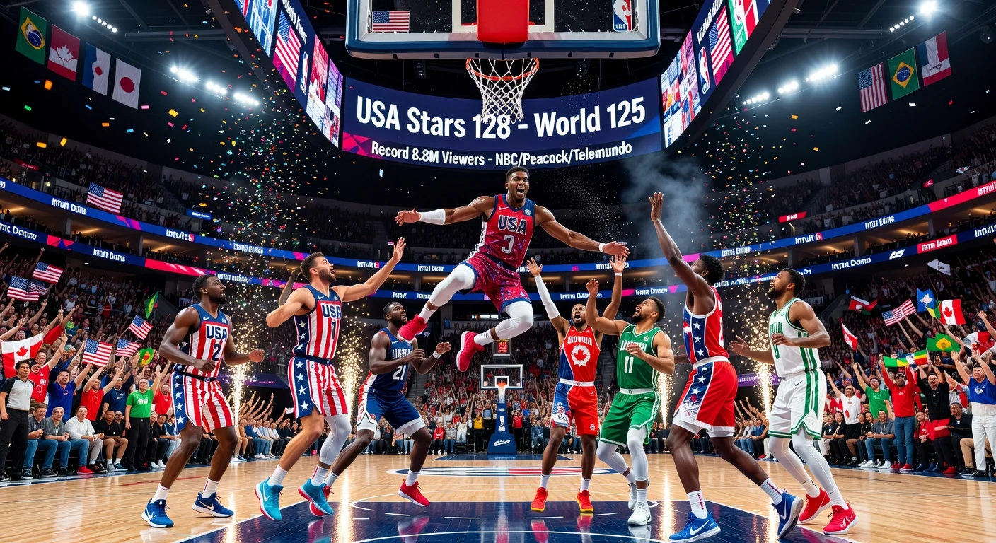 The NBA's revamped All-Star Game format drew an average of 8.8 million viewers, marking an 87% increase from the previous year and the largest audience since 2011. Broadcast on NBC, Peacock, and Telemundo for the first time on NBC since 2002, the event featured a competitive 'USA vs. the World' matchup. Anthony Edwards earned MVP honors with a standout performance.