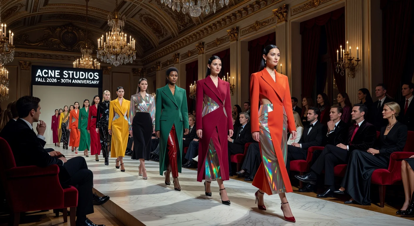 Photorealistic scene of Acne Studios' 30th anniversary fall 2026 collection runway show at Paris Fashion Week, blending elegance and unconventional details.