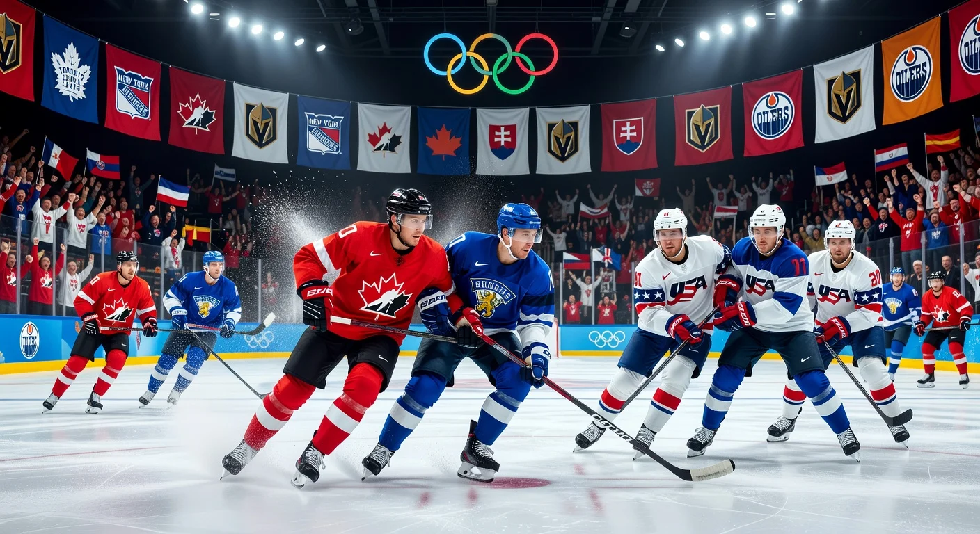 Dynamic photo illustration of NHL stars in Olympic men's hockey semifinals action with teams USA, Finland, Canada, and Slovakia competing intensely on the ice.