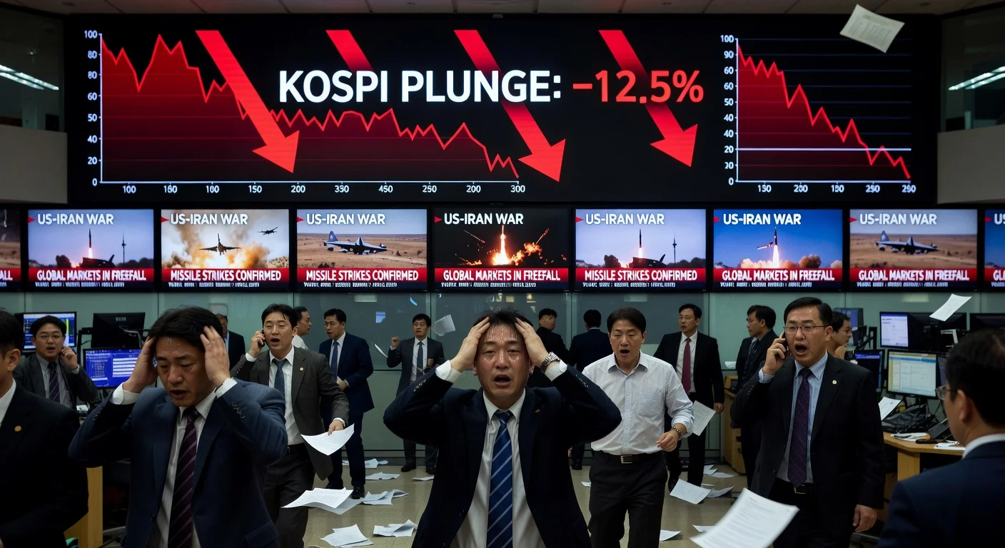 Dramatic scene of panicked traders at Seoul's stock exchange amid Kospi crash due to US-Iran conflict.