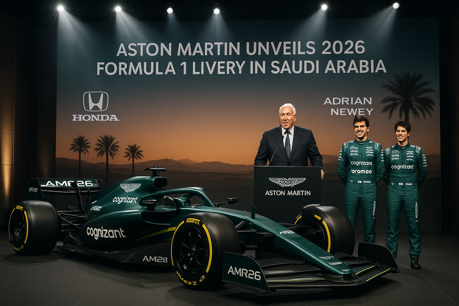 Aston Martin revealed its matte British Racing Green AMR26 livery for the 2026 Formula 1 season during a launch event in Saudi Arabia. Team principal Lawrence Stroll emphasized a new era bolstered by the Honda partnership and Adrian Newey's design, while drivers Fernando Alonso and Lance Stroll managed expectations for the early races. The event highlighted the team's strategy of prioritizing long-term development over initial performance.
