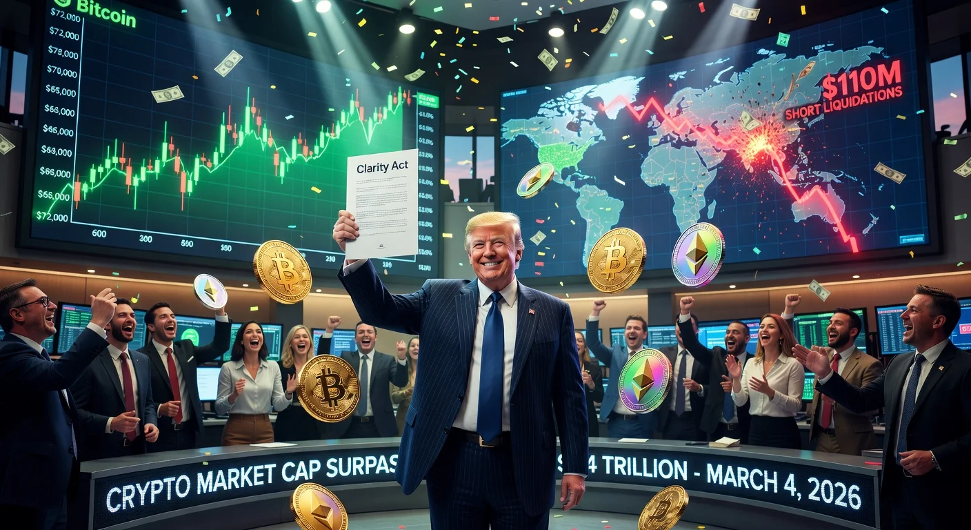 Bitcoin climbed above $72,000 on March 4, 2026, marking its highest level in nearly a month amid President Trump's endorsement of the Clarity Act, a key cryptocurrency market structure bill. The rally, which saw gains of around 6% to 8% in 24 hours, was bolstered by a South Korean stock market plunge and short position liquidations totaling $110 million. Other major cryptocurrencies like Ethereum and XRP also rose, pushing total market capitalization over $2.4 trillion.