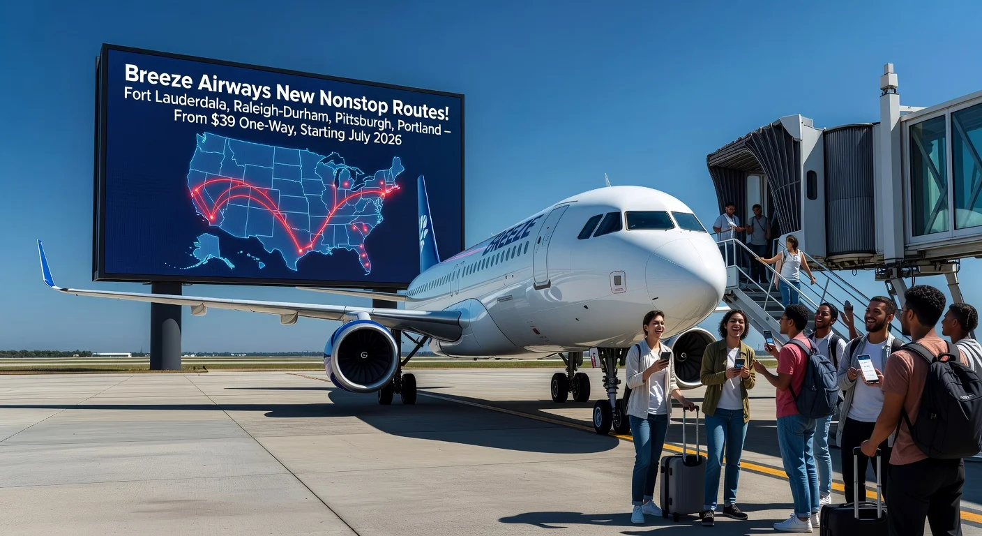 Breeze Airways revealed on February 24, 2026, a series of new nonstop flights and service expansions connecting various US cities to popular destinations. The routes, starting in July 2026, include connections to Fort Lauderdale, Raleigh-Durham, Pittsburgh, and Portland, with introductory fares as low as $39 one way. The expansions aim to serve underserved markets with affordable, direct travel options.