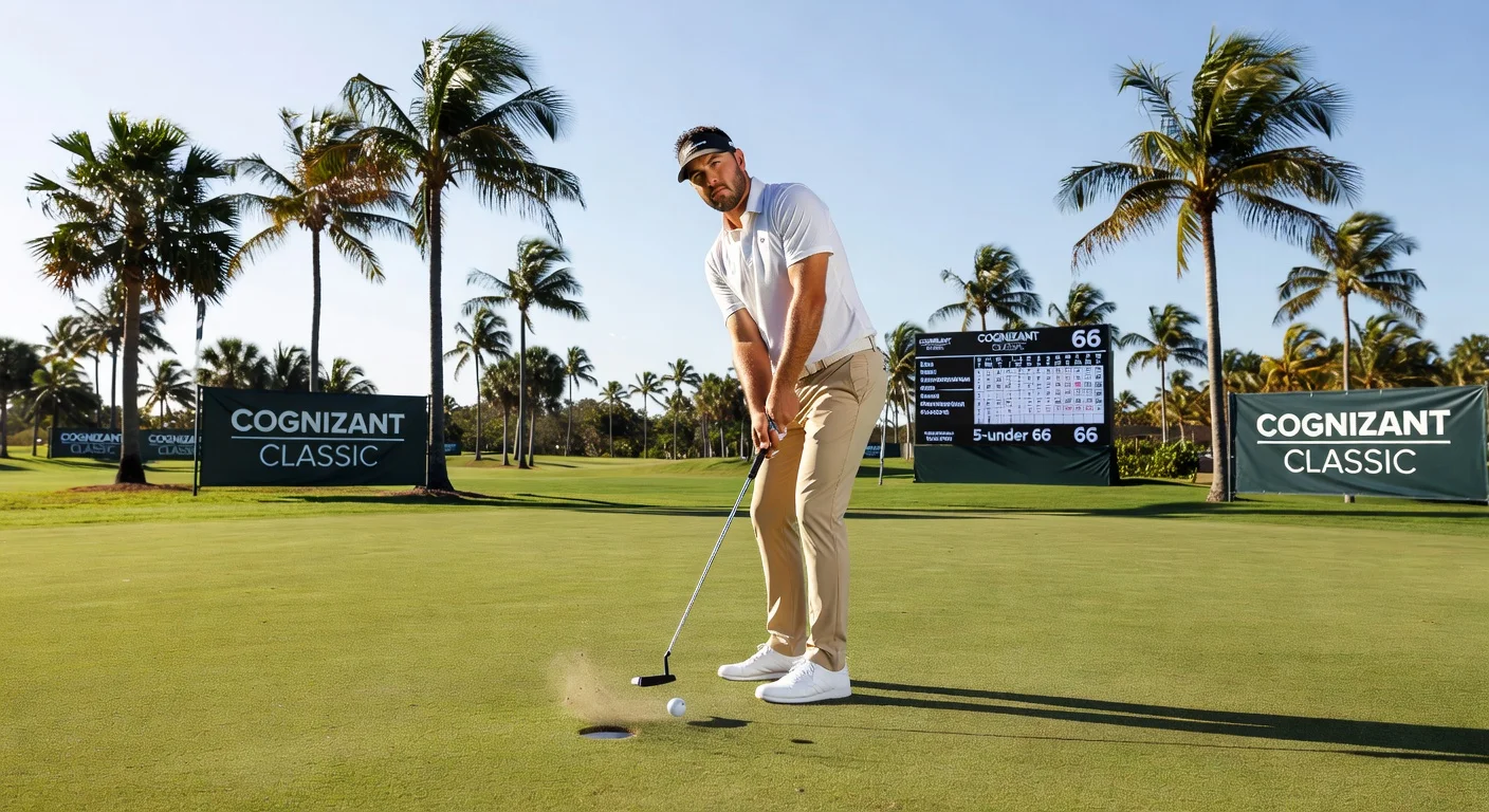 Brooks Koepka confidently sinks a putt on the green at the Cognizant Classic, rebounding to make the cut.