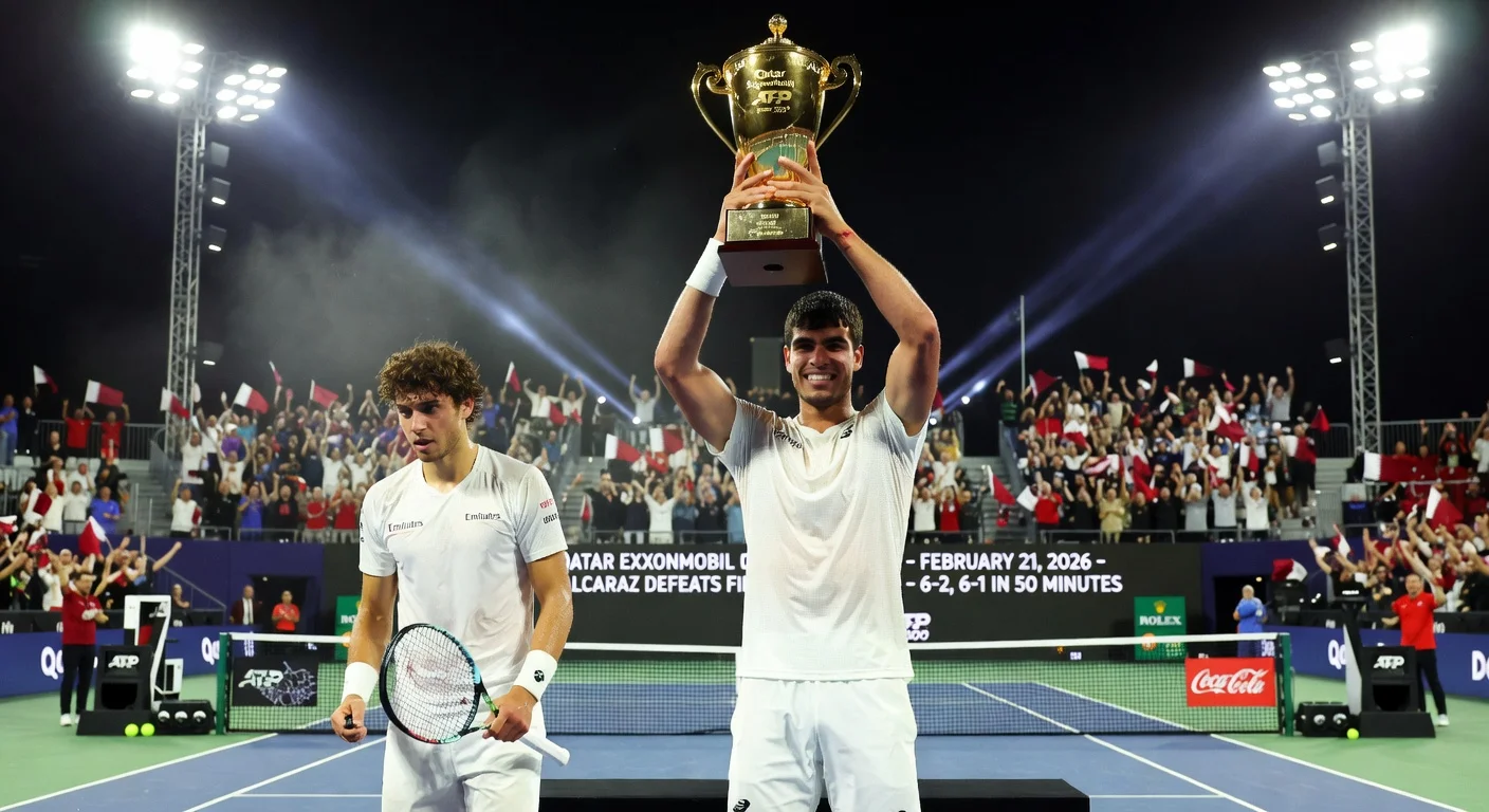 Carlos Alcaraz defeated Arthur Fils 6-2, 6-1 in the Qatar ExxonMobil Open final on February 21, 2026, securing the ATP 500 title in just 50 minutes. The victory marked Alcaraz's second trophy of the year and extended his perfect 12-0 record for 2026. Fils, returning from an eight-month injury layoff, smashed his racket in frustration but later apologized to the crowd.