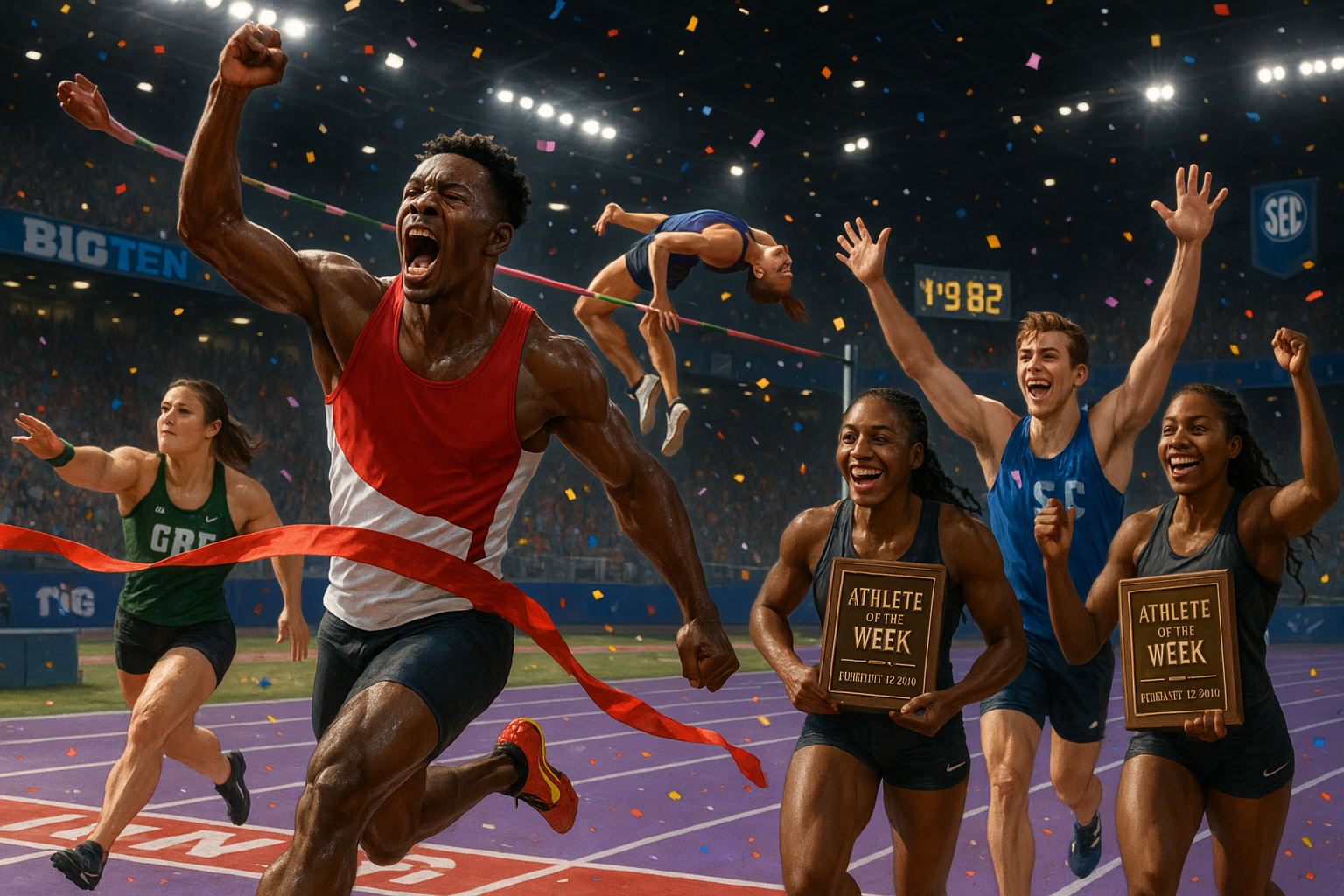 Dynamic photo illustration of celebrated college track athletes receiving indoor conference honors, mid-action on the track with awards and cheering crowd.