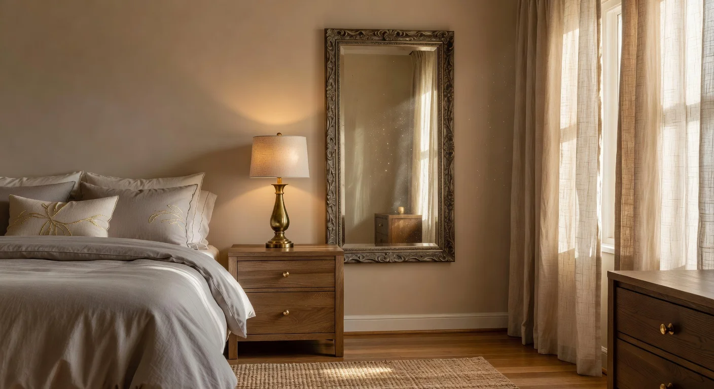 Kropovinsky recommends starting with one statement item, like an antiqued mirror or warm metal sconces over the bed, to introduce the trend without clutter. For modern bedrooms, options include arched, concave, or convex mirrors that provide shine while preserving privacy. Antique mirrors framed in bronze or gold offer a timeless polish, and smaller touches like sleek silver pendant lamps, gold dresser knobs, or hammered brass vases can catch light effectively.