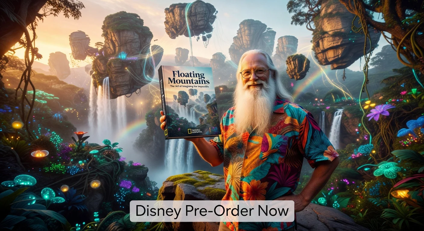 Joe Rohde, Disney Imagineer, holding his book 'Floating Mountains' against a Pandora-inspired floating mountains backdrop.