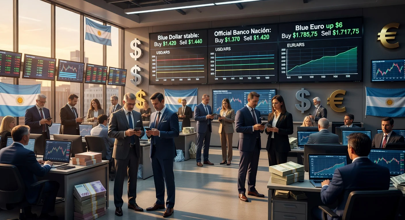 Realistic illustration of Argentine blue dollar and euro exchange rates stable at Friday market close, with digital boards showing specific buy/sell figures.