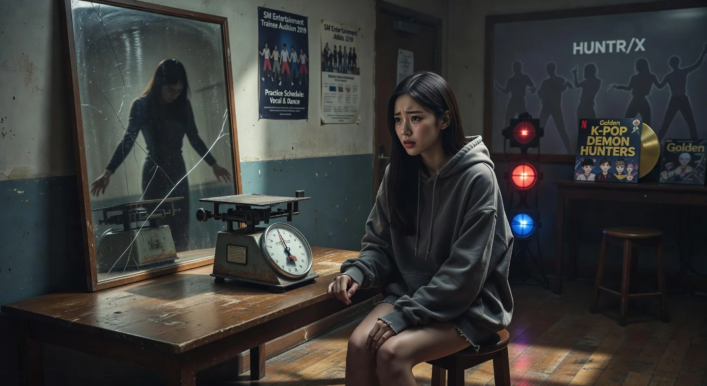 EJAE in contemplative pose reflecting on SM Entertainment trainee trauma, with symbolic scale, mirror, and K-pop success elements.