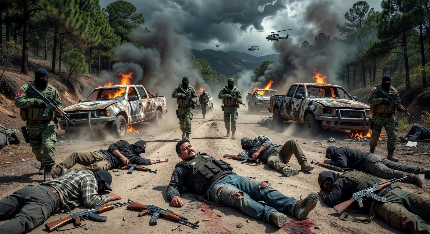 Dramatic illustration of Mexican forces killing CJNG leader 'El Mencho' in a Tapalpa operation, showing aftermath with bodies, soldiers, and burning vehicles.