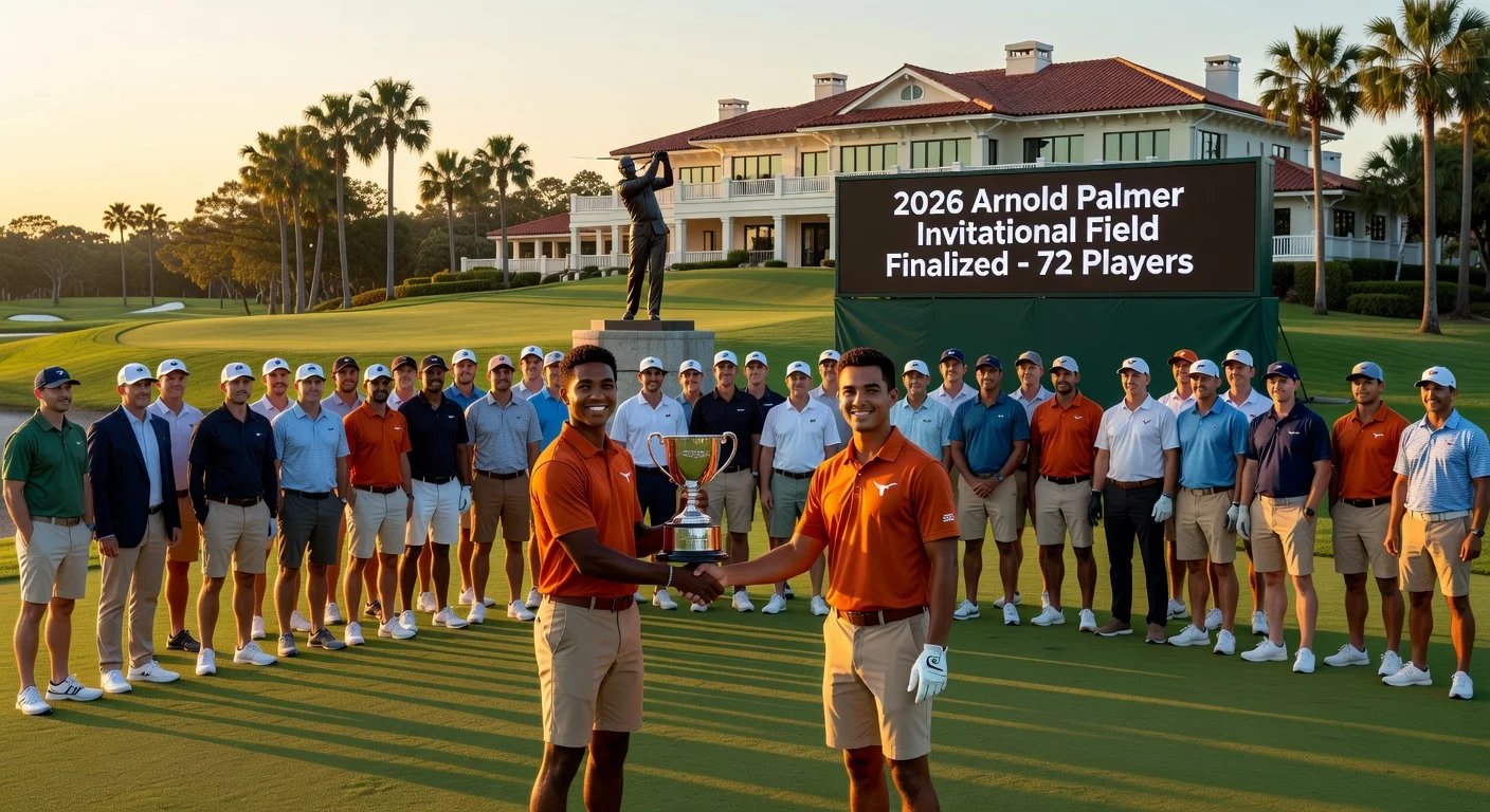 The field for the 2026 Arnold Palmer Invitational has been set at 72 players following the Cognizant Classic, with qualifiers from the Aon Next 10 and Aon Swing 5 categories joining sponsor invitees. Notable newcomers include Cognizant Classic winner Nico Echavarria and Texas sophomore Daniel Bennett making his PGA Tour debut. The event marks the third signature tournament of the season at Bay Hill Club and Lodge.