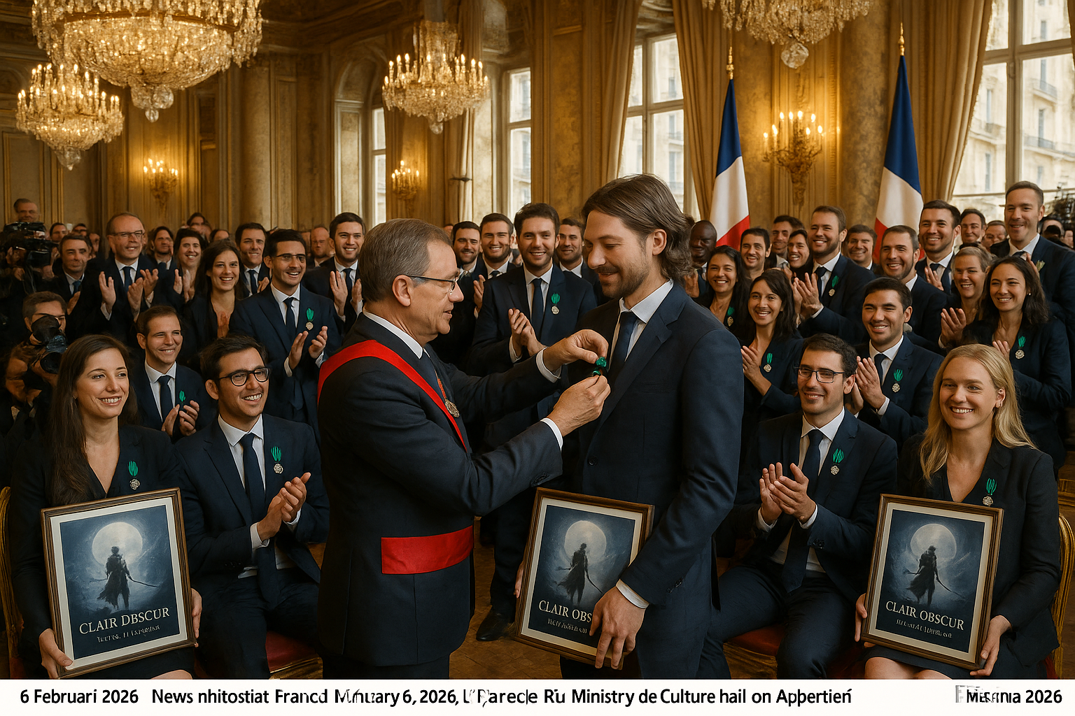 French Ministry of Culture knights 28 Sandfall Interactive developers as Chevaliers in the Order of Arts and Letters for Clair Obscur: Expedition 33 at a grand ceremony.