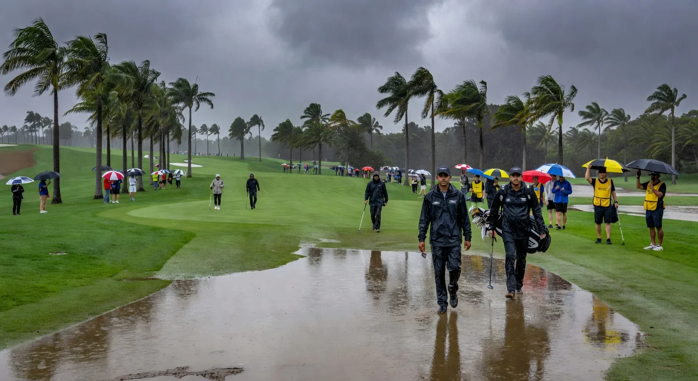 Tournament host Tiger Woods commented on potential scheduling changes due to weather, noting that options like moving to August are under consideration with title sponsor Genesis. The rain is expected to taper off by midafternoon, with calmer conditions forecast for the weekend.