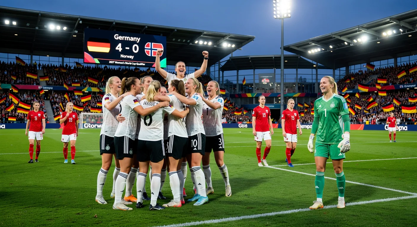 German women's soccer team celebrates 4-0 win over Norway in World Cup qualifier, with goalkeeper Ann-Katrin Berger highlighted.