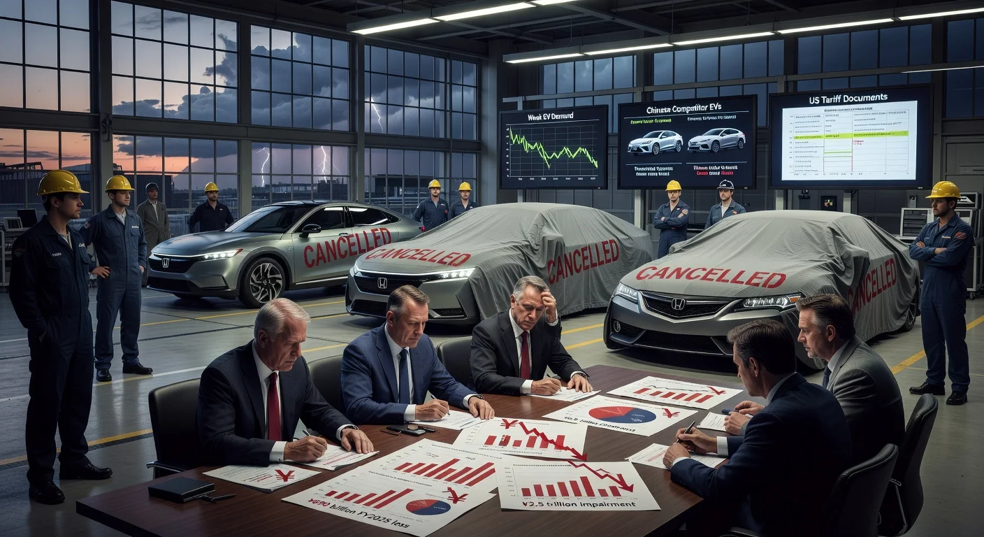 Dramatic photo of Honda's Ohio EV factory with cancelled prototypes and financial loss charts amid EV market downturn.