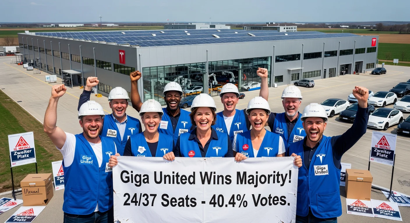 The independent 'Giga United' list, led by incumbent chair Michaela Schmitz, secured 24 of 37 seats with 40.4% of votes in the works council election at Tesla's Gigafactory Grünheide. IG Metall's 'Tesla Workers GFFB' list finished second at 31.1%, down from 39.4% in 2024, amid legal disputes, anti-union campaigns, and Elon Musk warnings against union influence.