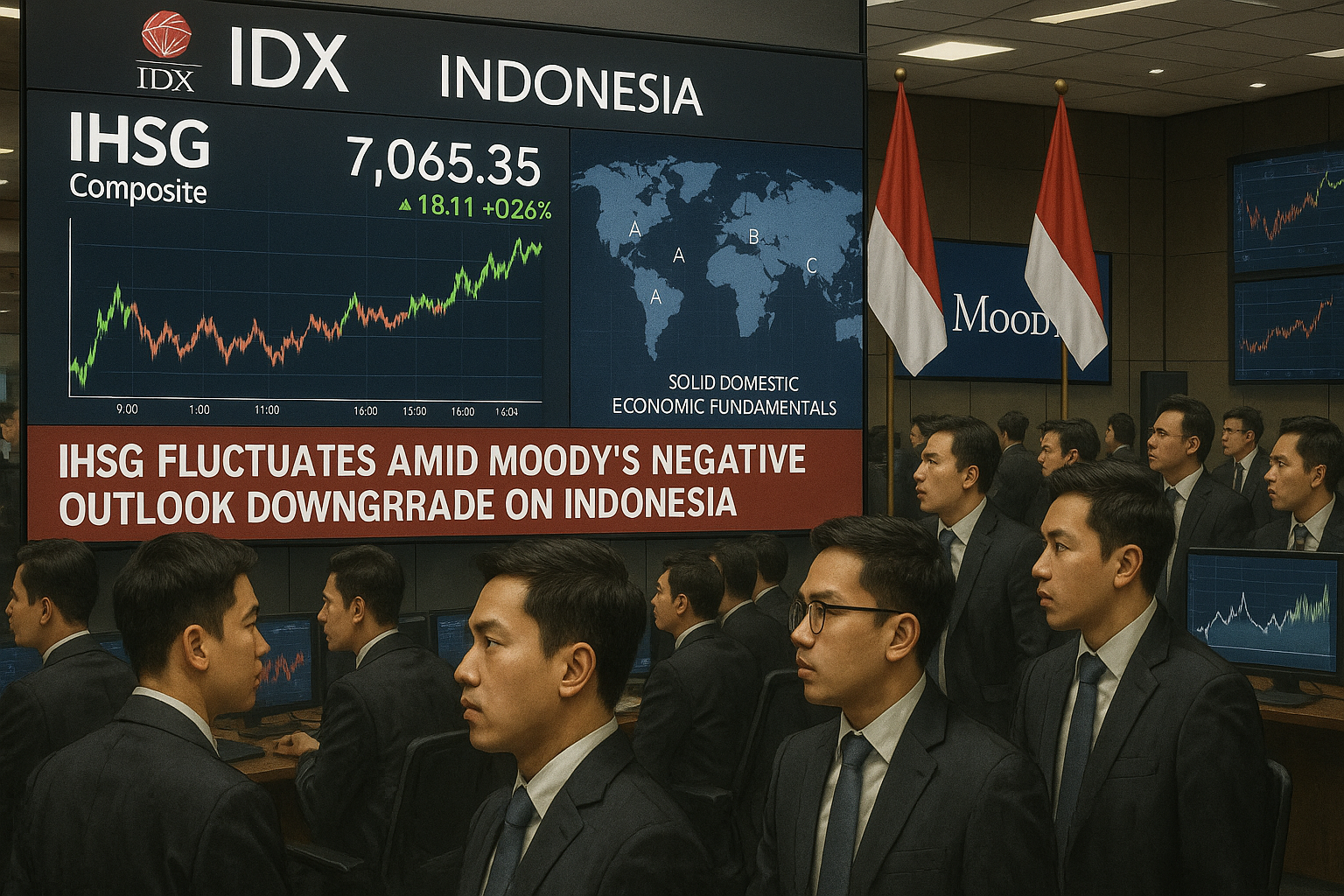 Busy Jakarta stock traders monitoring fluctuating IHSG index screens amid Moody’s Indonesia credit outlook downgrade news.
