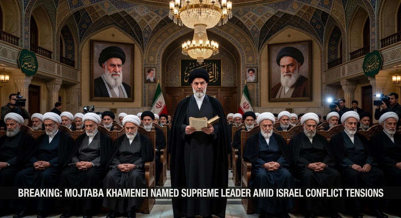 Dramatic illustration of Iran's Assembly of Experts naming Mojtaba Khamenei as new Supreme Leader following Ali Khamenei's death.