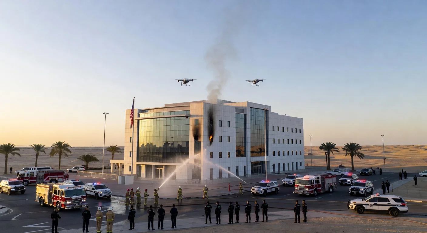 Illustration depicting Iranian drones attacking the US Embassy in Riyadh, with minor fire damage and emergency responders on scene.