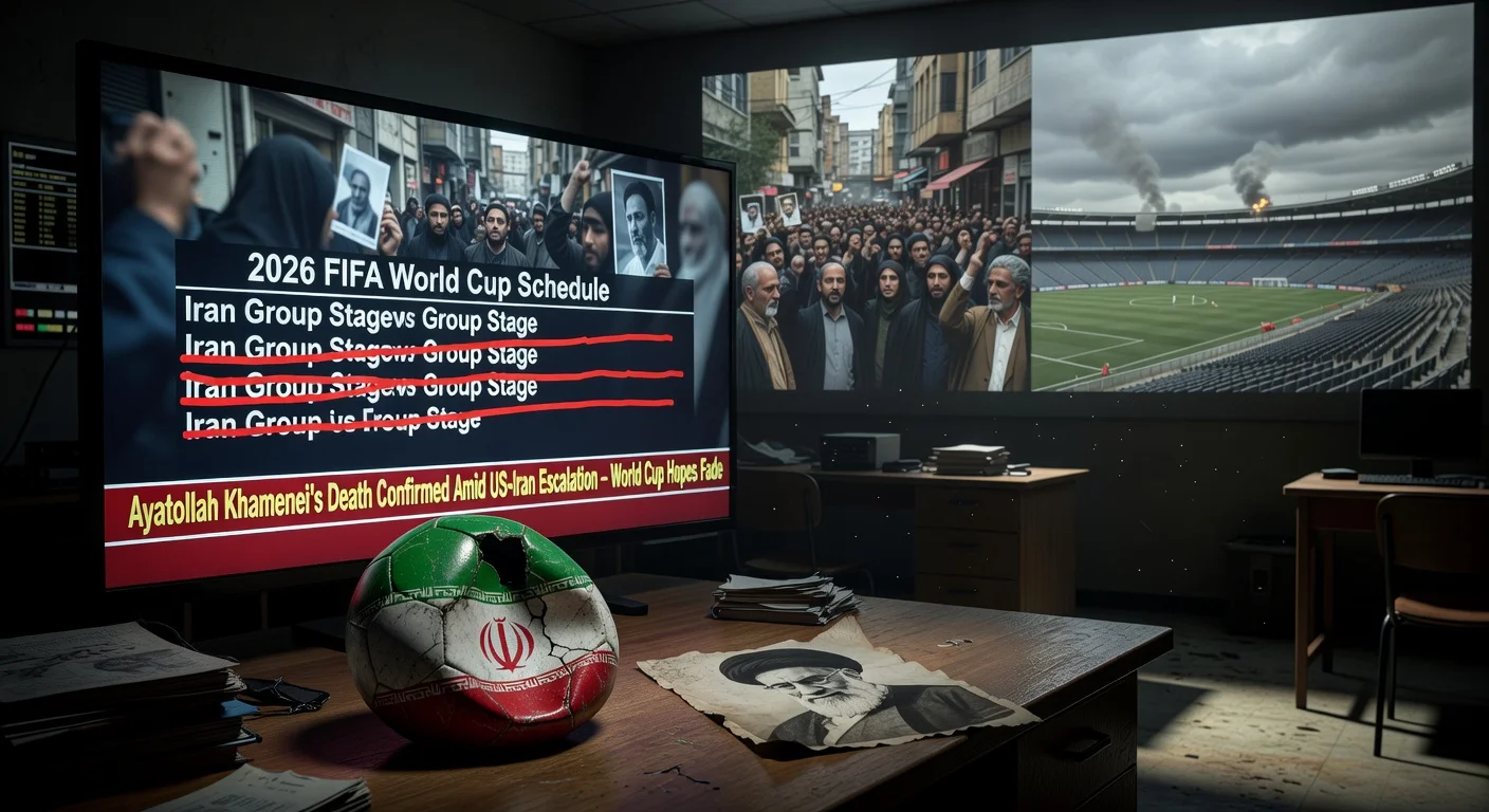 Dramatic illustration of Iran's 2026 World Cup uncertainty following Supreme Leader Khamenei's death in US-Iran conflict.