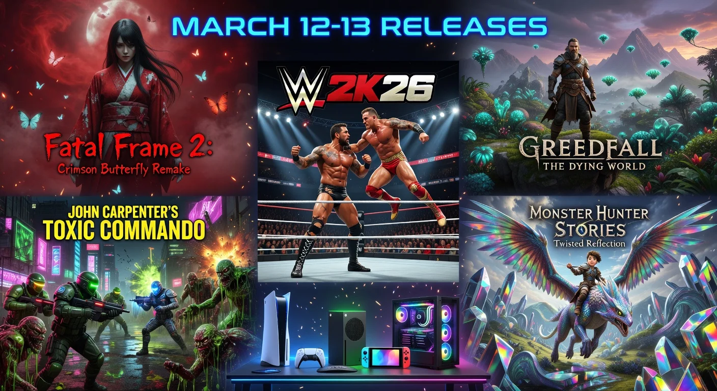Building on the diverse March 2026 lineup, the second week delivers major launches across PS5, Xbox Series X/S, Switch 2, and PC. Highlights include a packed March 12 with WWE 2K26, Fatal Frame 2: Crimson Butterfly Remake, Greedfall: The Dying World, and John Carpenter’s Toxic Commando, plus Monster Hunter Stories 3: Twisted Reflection on March 13—breaking March's traditionally quiet streak.