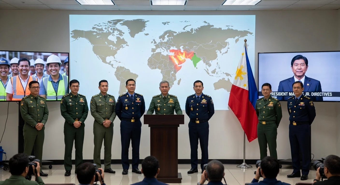 Philippine defense officials at press conference assure no Middle East threat to nation or OFWs, with reassuring map visuals.