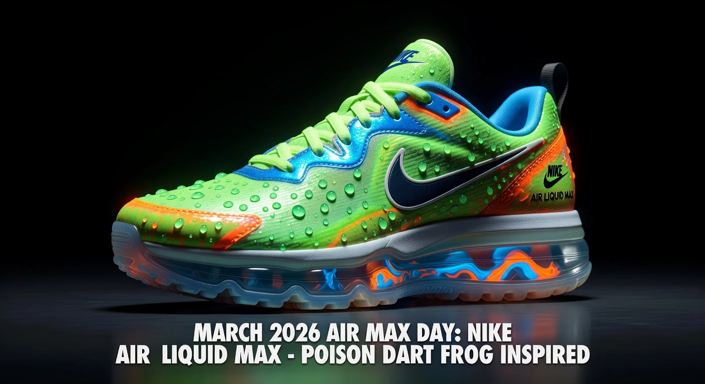 Nike has officially unveiled the Air Liquid Max, a new sneaker featuring a flexible, low-profile Air unit, set to debut on Air Max Day, March 26, 2026. The model draws inspiration from poison dart frogs and includes collaborations with rapper Yeat and Fragment Design's Hiroshi Fujiwara. Additional colorways are expected throughout the year.