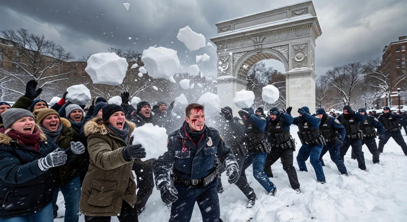 NYPD officers under snowball attack by mob in Washington Square Park, with visible injuries.