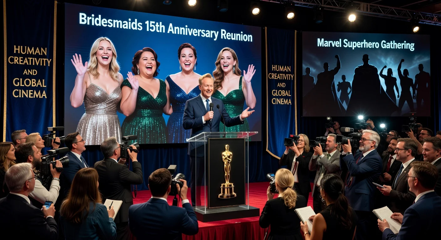 The creative team for the 98th Academy Awards held a press conference on March 11, 2026, confirming the previously announced Bridesmaids cast reunion—marking the 2011 comedy's 15th anniversary with stars Kristen Wiig, Maya Rudolph, Melissa McCarthy and Rose Byrne—and teasing a Marvel superhero gathering. Details on musical performances from nominated films Sinners and KPop Demon Hunters were shared, alongside the show's theme of human creativity and global cinema. Host Conan O’Brien addressed balancing fun with current events.