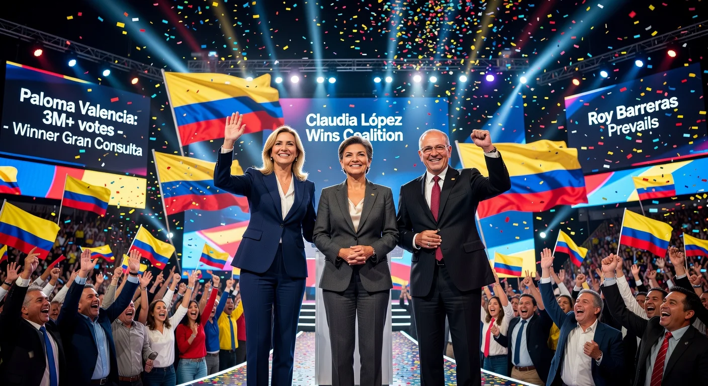 In the March 8, 2026 legislative elections, Colombia selected its presidential candidates through three interparty consultations. Paloma Valencia dominated the Gran Consulta por Colombia with over 3 million votes, while Claudia López and Roy Barreras prevailed in their respective coalitions with lower figures.