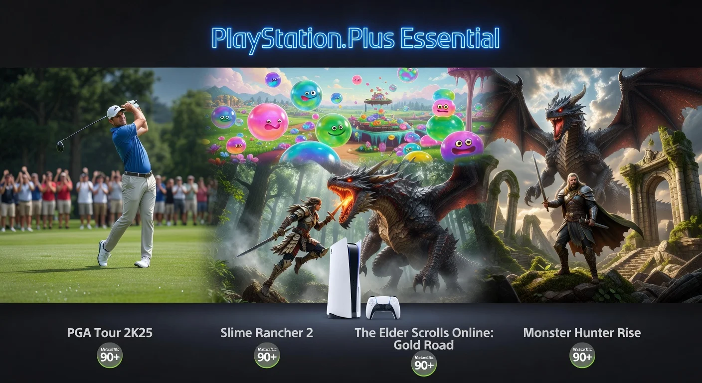 Sony announced the March 2026 PlayStation Plus Essential tier free games on February 25, available to claim starting March 3 until April 6 as February's lineup expires. The four titles—PGA Tour 2K25, Slime Rancher 2, The Elder Scrolls Online Collection: Gold Road, and Monster Hunter Rise—offer diverse gameplay across PS5 and select PS4, with high Metacritic scores and extended playtime.