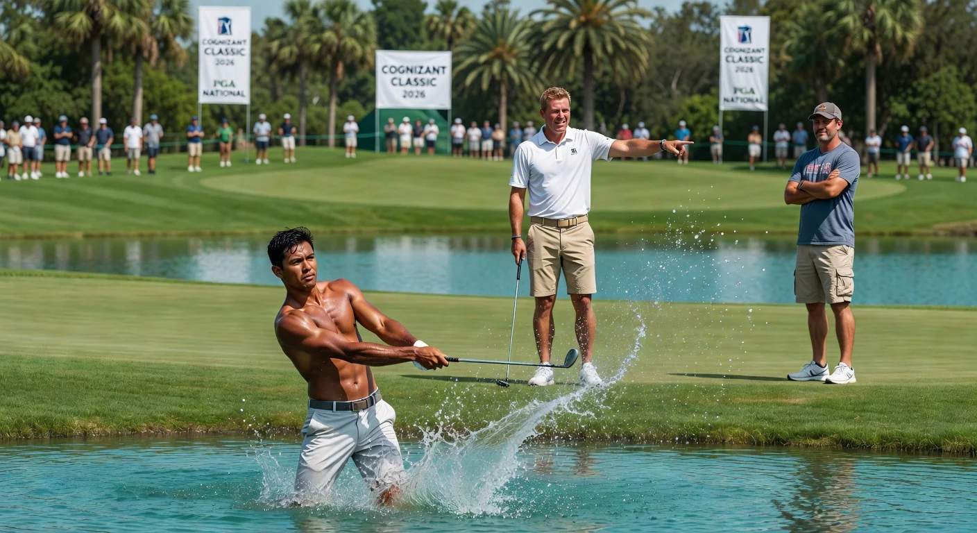In the second round of the 2026 Cognizant Classic at PGA National, Isaiah Salinda drew attention by removing his shirt to play a ball from the lake on the 17th hole, while Billy Horschel confronted a heckling fan after a poor shot on the 15th. Steven Fisk contributed a notable 23-foot birdie putt on the seventh hole. Players also voiced concerns over the course's overseeding, which has led to lower scores.