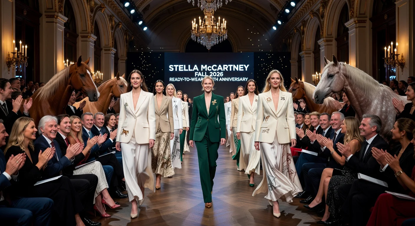 Stella McCartney presented her Fall 2026 Ready-to-Wear collection on March 4, 2026, during Paris Fashion Week, celebrating her brand's 25th anniversary with a sustainable runway show featuring horses and personal references. The event drew a front-row crowd of celebrities including family members and friends. Designs highlighted eco-friendly innovations and nods to her career influences.