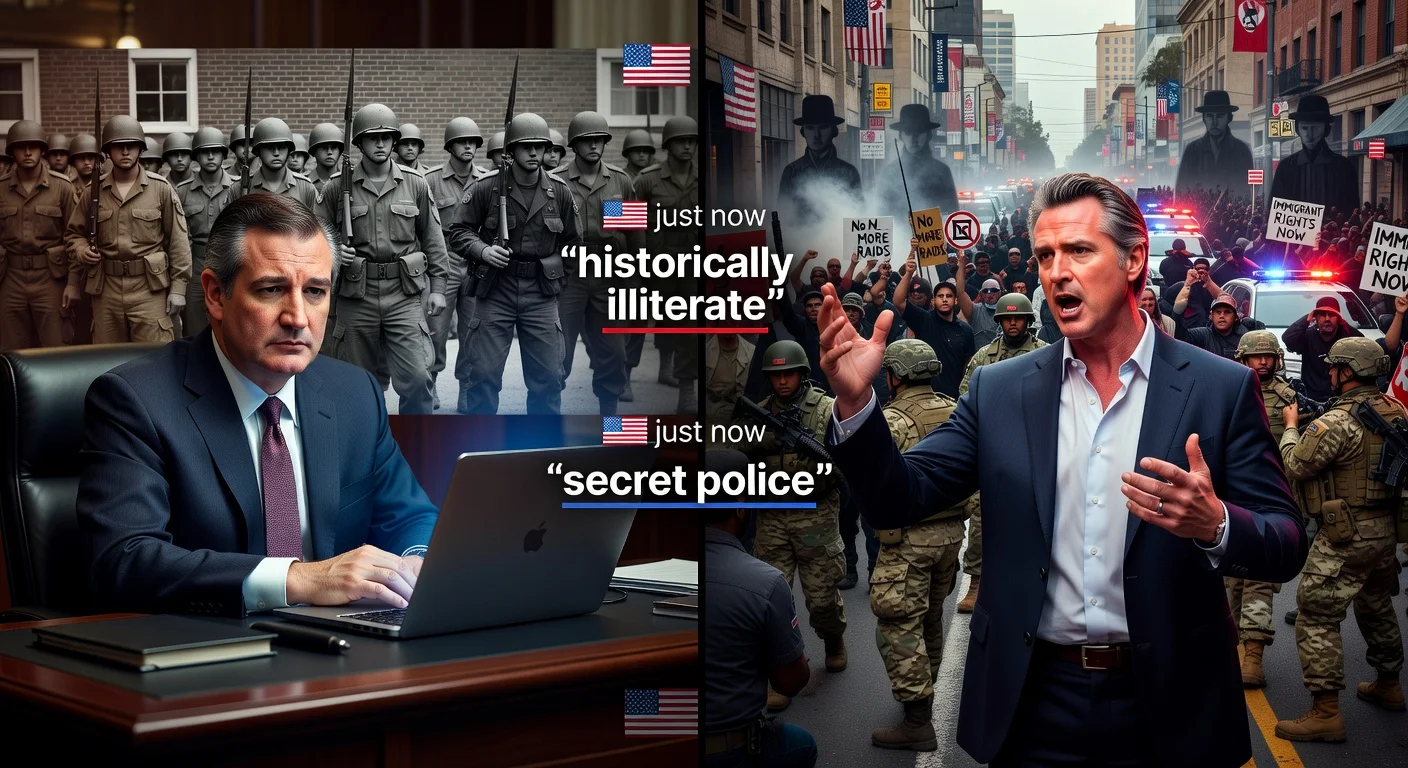 Illustration depicting the online clash between Ted Cruz and Gavin Newsom over federal troops in LA compared to Nazi secret police.