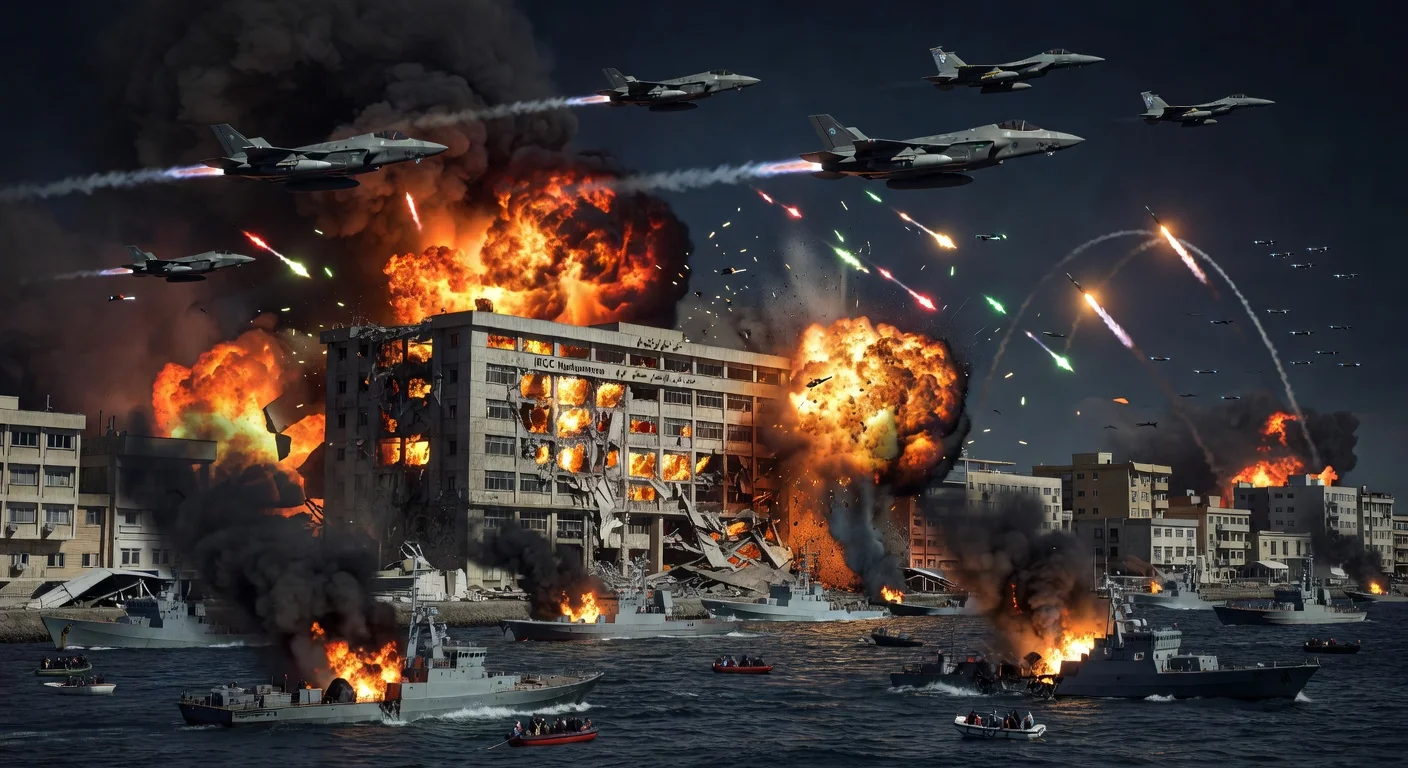Dramatic illustration of US-Israel airstrikes destroying IRGC headquarters in Tehran and sinking Iranian ships amid retaliation.