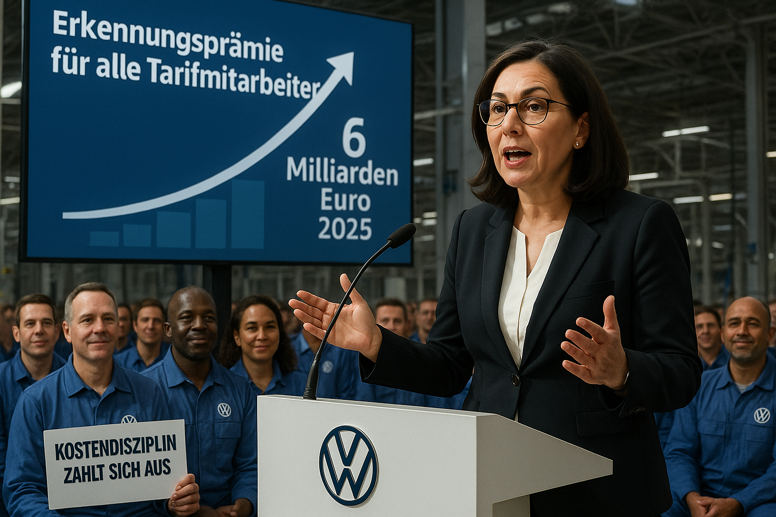 VW's works council is demanding a recognition premium for all tariff employees after the company revised its 2025 cash flow upward to six billion euros. Works council chair Daniela Cavallo justifies this with the workforce's joint cost discipline. The premium could be paid out in May 2026.