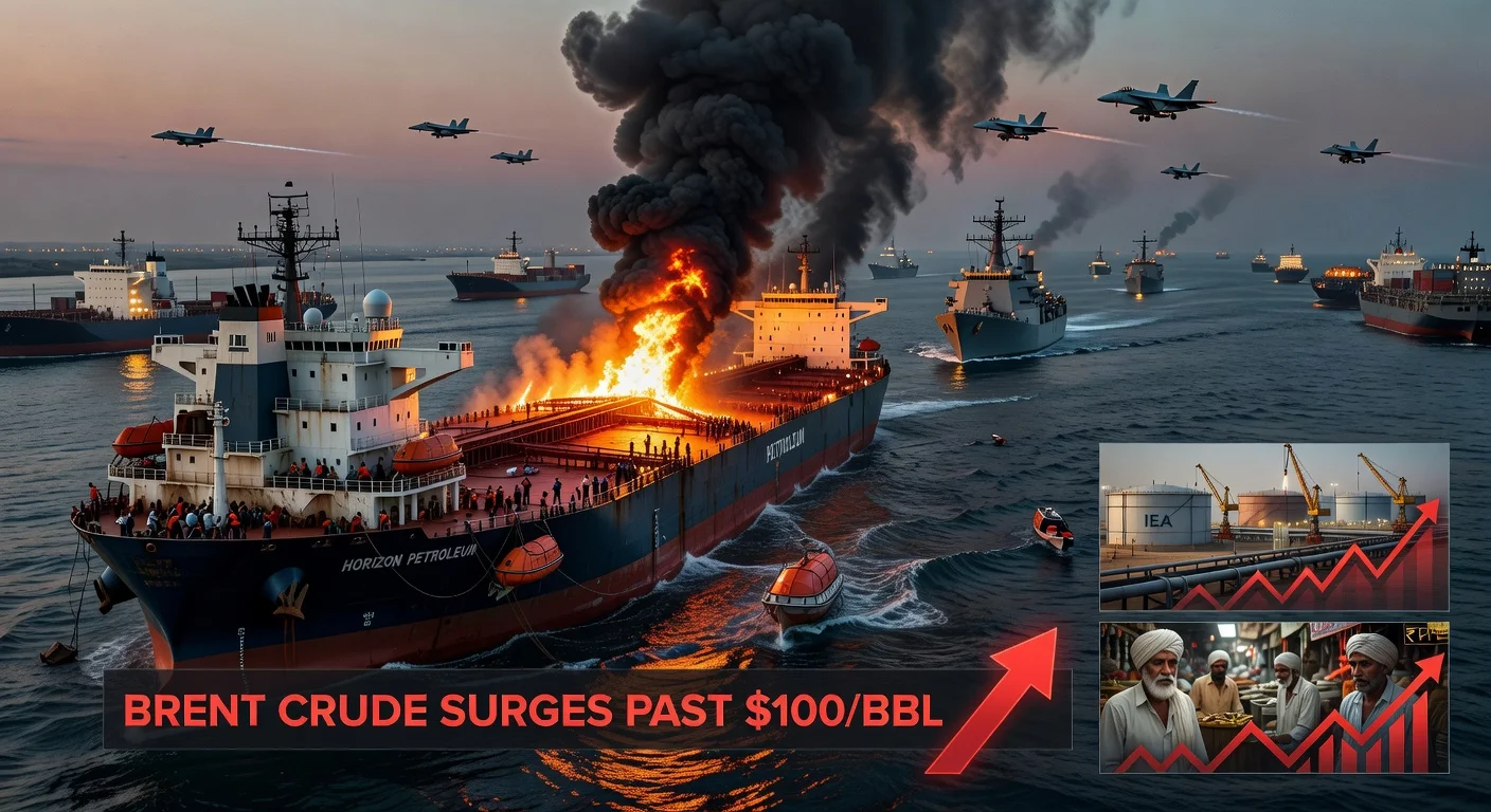 Dramatic illustration of fiery oil tanker attack in Strait of Hormuz driving Brent crude prices over $100, with naval response, reserve releases, and India inflation impacts.