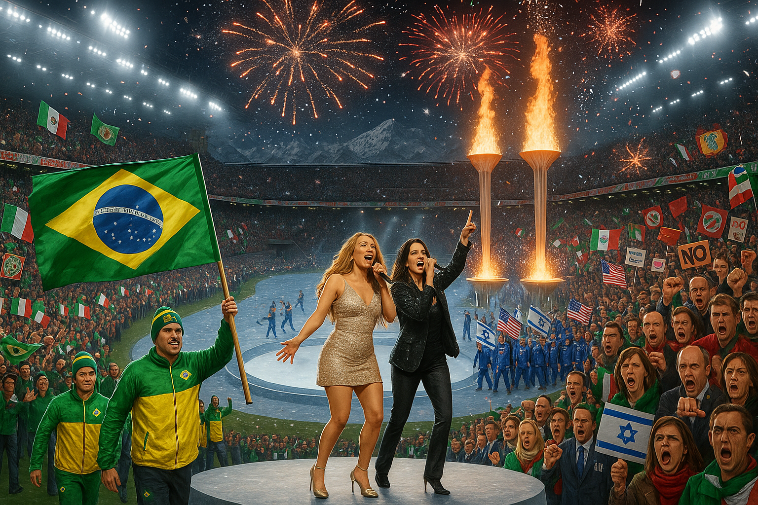 Photorealistic scene of Milan-Cortina Winter Olympics opening at San Siro Stadium: performers Mariah Carey and Laura Pausini on stage, Brazilian athletes parading, boos toward US/Israel delegations, dual Olympic torches lit amid cheering crowd.