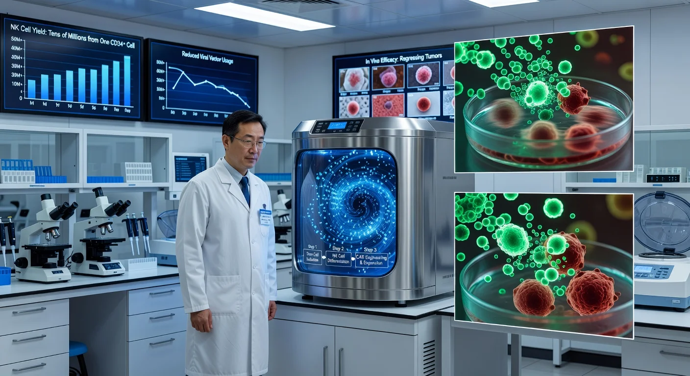 A research team led by Jinyong Wang at the Chinese Academy of Sciences says it has developed a three-step laboratory process that can generate large numbers of induced natural killer (iNK) cells — including CD19 CAR-engineered versions — starting from CD34+ stem and progenitor cells from umbilical cord blood. In a Nature Biomedical Engineering study published in October 2025, the researchers reported output on the order of tens of millions of NK cells from a single starting CD34+ cell in their system and showed anti-tumour activity in mouse models of blood cancers, while also reporting sharply reduced viral-vector use for CAR delivery compared with approaches that modify mature NK cells.