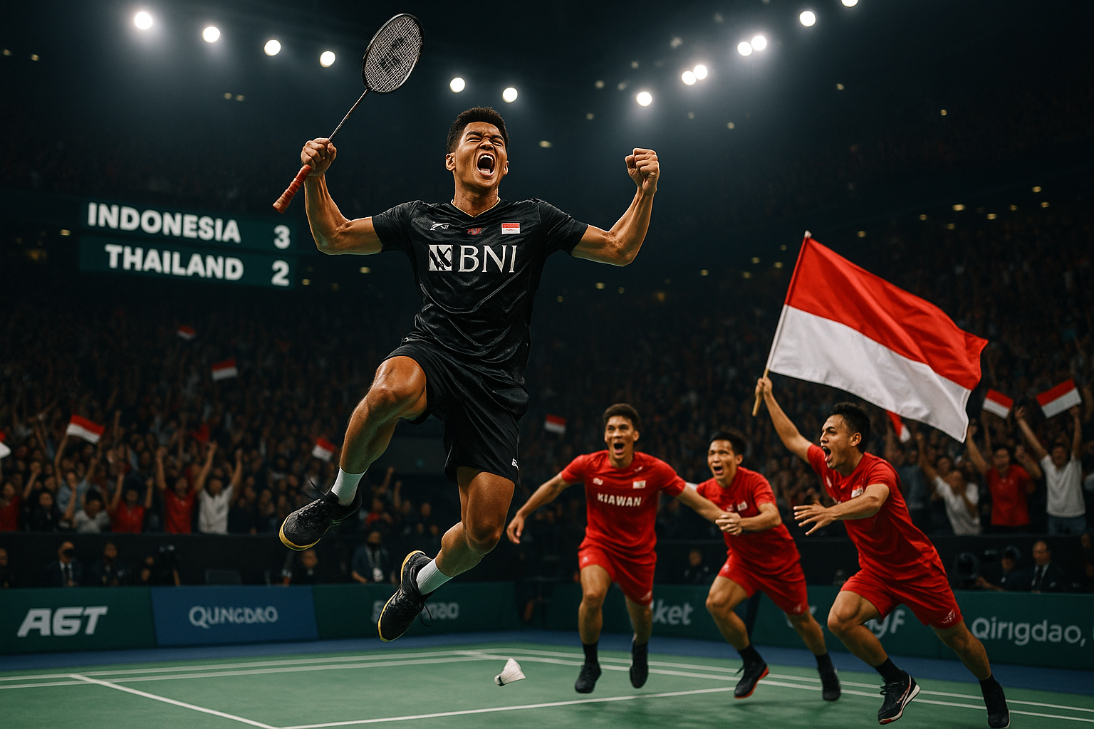 Richie Duta Richardo of Indonesia celebrates clinching 3-2 team win over Thailand in BATC 2026 quarterfinals, advancing to semifinals.