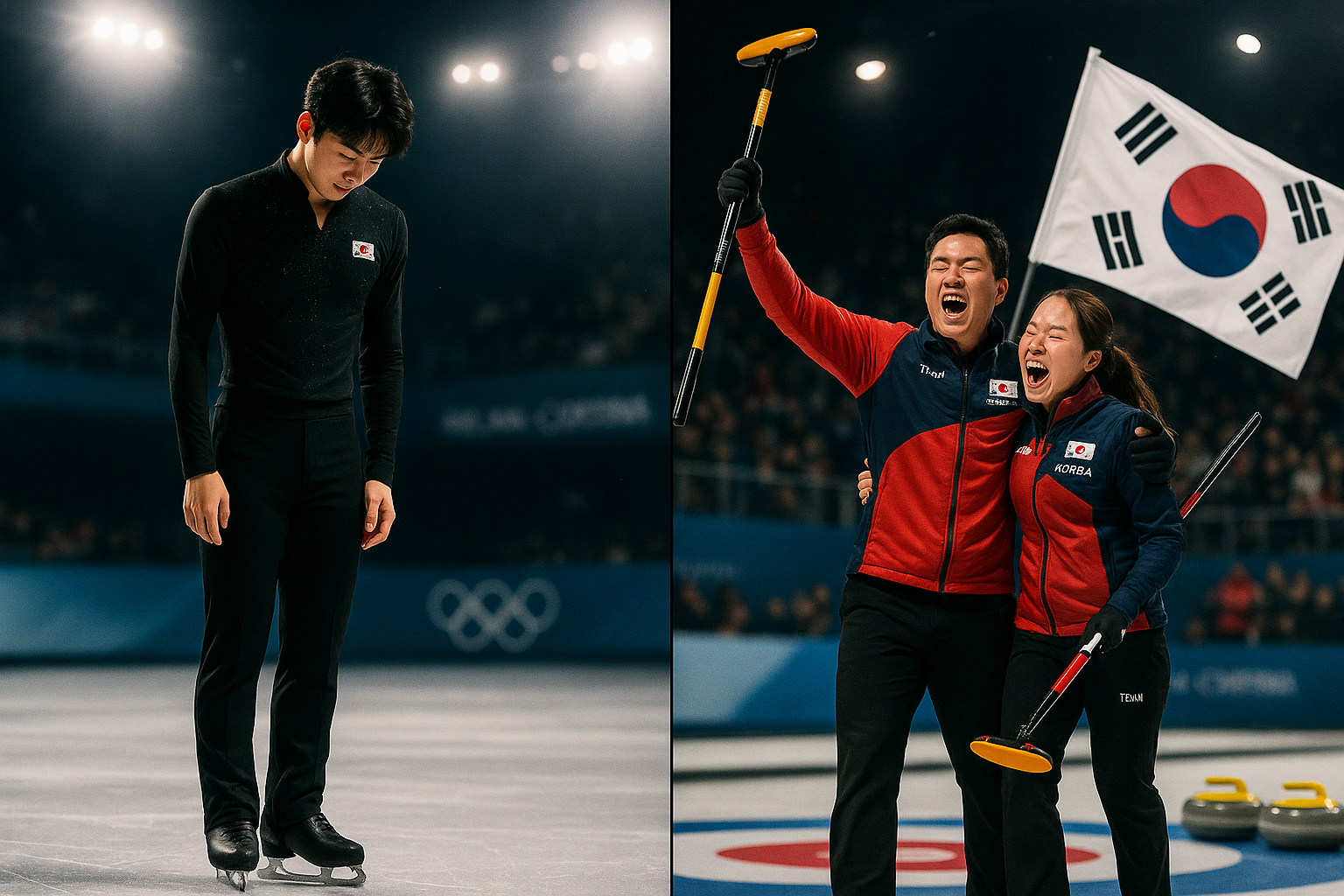 Split-image illustration: dejected South Korean figure skater Cha Jun-hwan on ice after team event elimination, contrasted with joyful curling duo celebrating first mixed doubles win at Milan-Cortina Olympics.