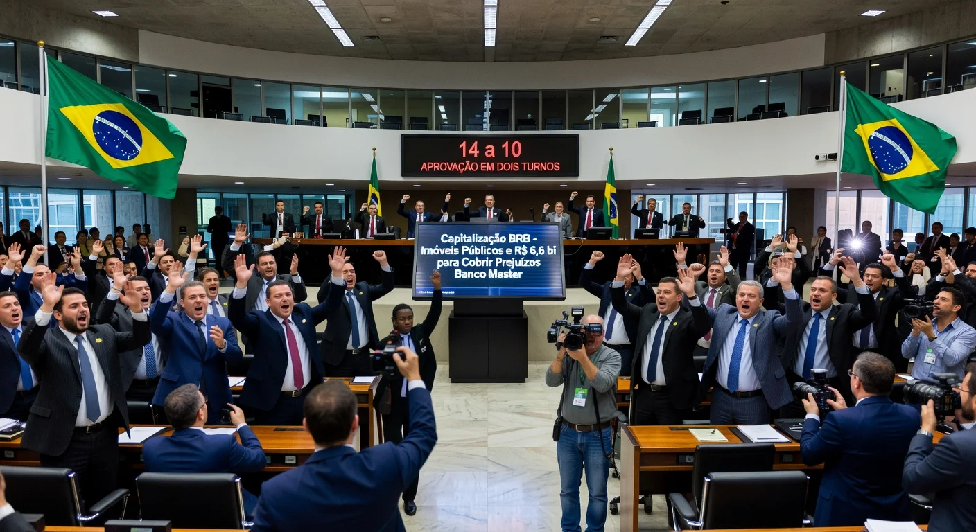 The Legislative Assembly of the Federal District approved, by 14 votes to 10 in two rounds, the bill authorizing the DF Government to capitalize the Bank of Brasília (BRB) with nine public properties and loans of up to R$ 6.6 billion. The measure aims to cover losses related to operations with Banco Master. The text now goes to Governor Ibaneis Rocha for sanction.
