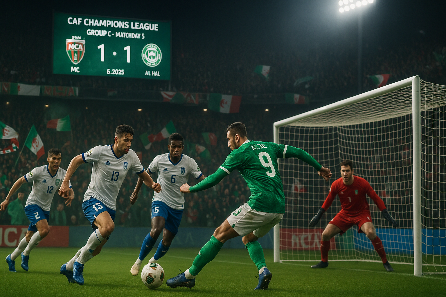 Dynamic stadium scene of MC Alger hosting Al Hilal in CAF Champions League Matchday 5, capturing intense group stage action amid tight quarter-final race.