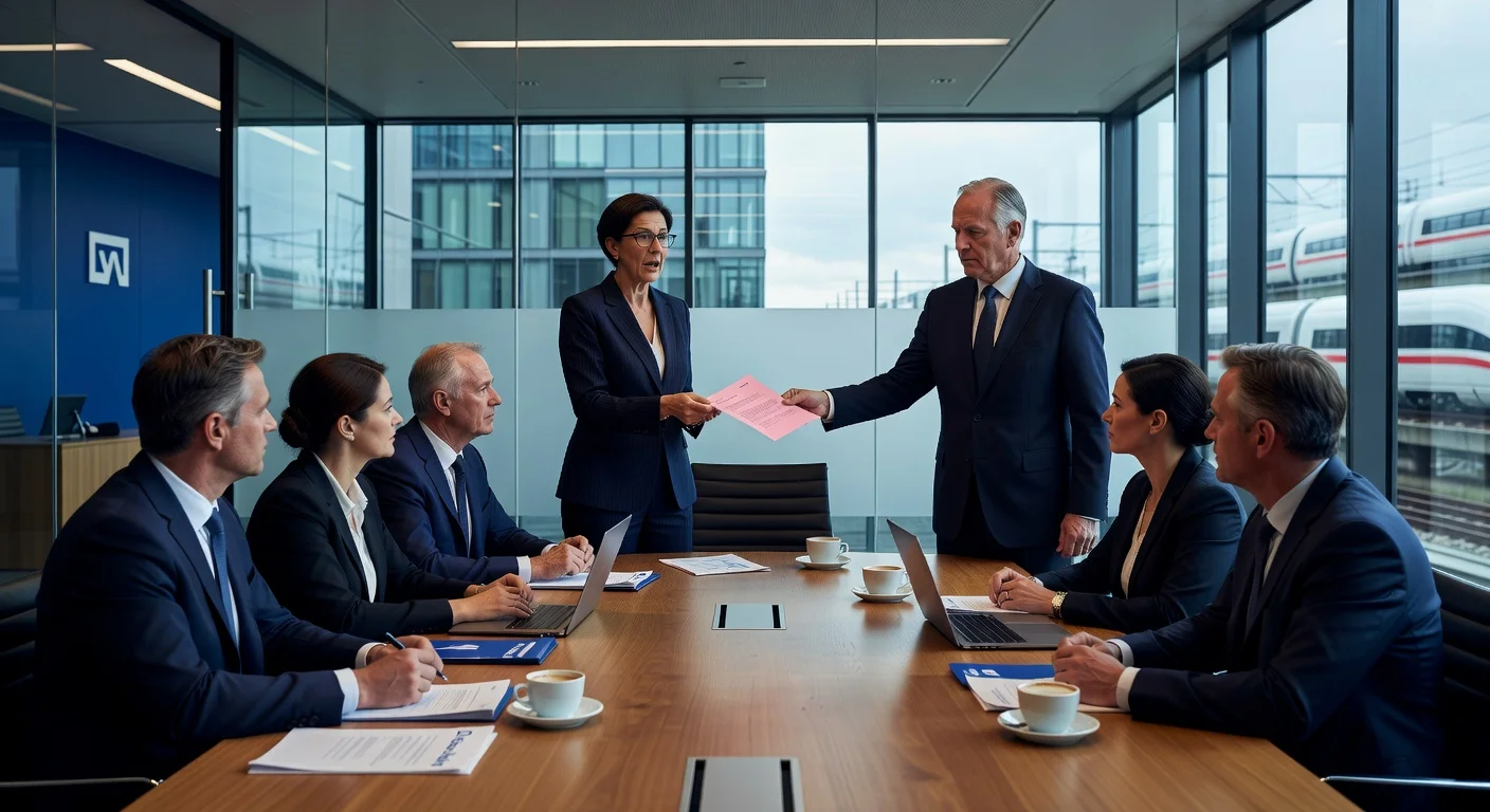 Tense boardroom scene of Deutsche Bahn supervisory board dismissing finance executive Karin Dohm after three months amid conflicts.