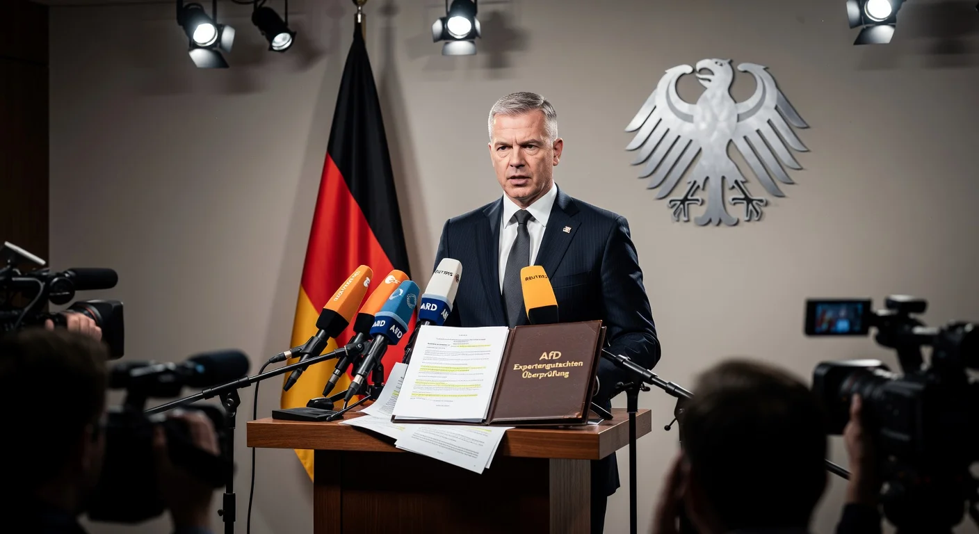 German Interior Minister Alexander Dobrindt announces review of AfD extremist classification at press conference, with ministry documents on podium.